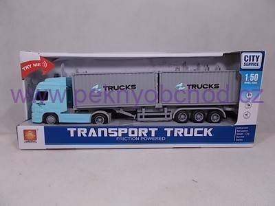 Kamión se zvuky, pohon na setrvačník, po stisku tlačítka bliká a vydává zvuky. Kontejnery se dají vzadu otevírat a nakládat. Velikost celé soupravy 33 cm. Pro děti od 3 let.