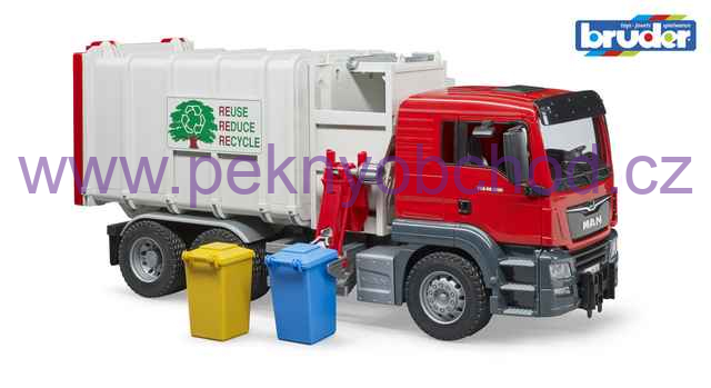 Man TGS popelář Bruder 03761, kvalitní mechanicky plně funkční výrobek, velikost auta 55 cm. Můžete nákládat a vykládat popelnice a vyklápět celý vůz, otevírat přední dveře. Můžete dokoupit příslušenství Bruder, maják, postavičky a další. Vhodné pro děti od 4 let.