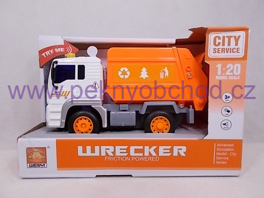 Popelářské auto vydává různé zvuky po stisku tlačítek na kabině, pohon na setrvačník. Velikost auta 18 cm. Baterie jsou součástí výrobku.